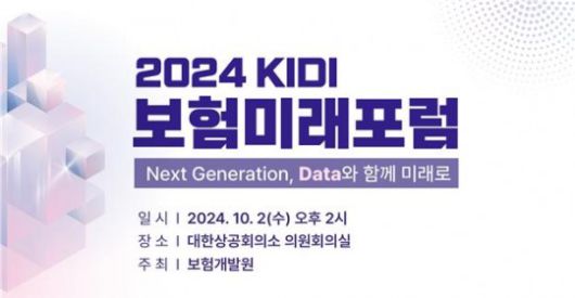 보험개발원은 10월 2일 대한상공회의소에서 'Next Generation, Data와 함께 미래로'라는 주제로 '2024 KIDI 보험미래포럼'을 개최한다고 25일 밝혔다.