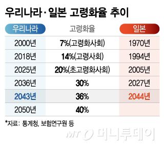 우리나라는 내년이면 고령화율이 20%인 초고령화 사회로 진입한다. 일본은 20년 전인 2005년에 초고령화 사회로 진입했지만 2043년에는 한국이 일본의 고령화율을 추월할 것으로 추산됐다. 2043년 한국의 고령화율은 36%로 일본(2044년)보다 빠르다.