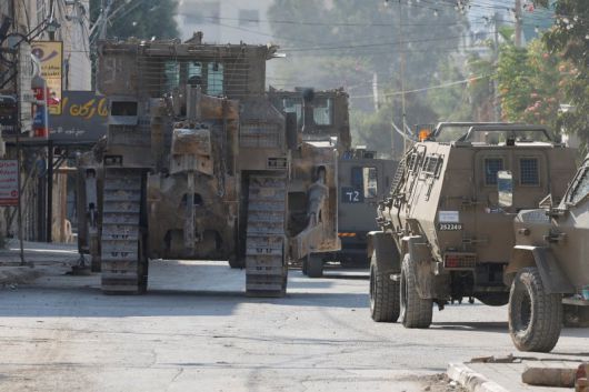 이스라엘 점령군 차량들이 25일(현지시간) 팔레스타인 서안의 제닌에서 이동하고 있다. 이스라엘 군 참모총장은 이날 레바논 지상전에 대비하라고 군에 지시했다. 로이터 연합 |