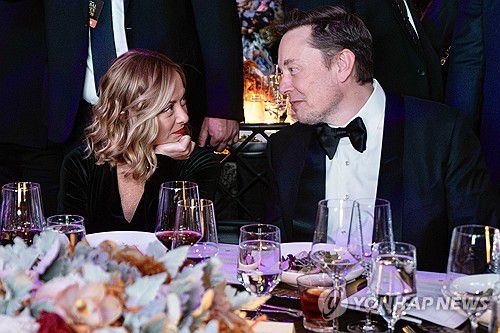 (로스앤젤레스=연합뉴스) 임미나 특파원 = 일론 머스크(53) 테슬라 최고경영자(CEO)와 조르자 멜로니(47) 이탈리아 총리가 다정한 눈빛을 나누는 모습이 담긴 사진이 온라인에서 화제가 되고 있다.