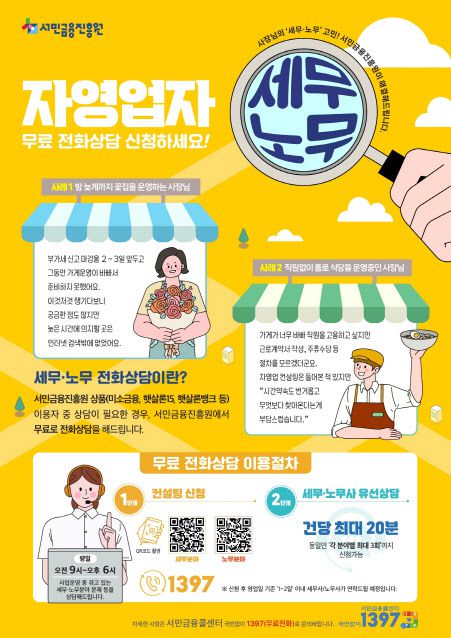소규모 사업장에 꼭 필요한 세무·노무 지식을 전달해 자영업 사업 역량 강화에 도움을 주겠다는 취지다. 상담 시간은 1회 20분이며, 1명당 3회까지 이용할 수 있다. 미소금융, 햇살론15 등 서금원 상품을 이용한 자영업자는 QR코드를 이용하거나 서민금융통합지원센터, 미소금융지점에 방문해 무료로 신청할 수 있다.