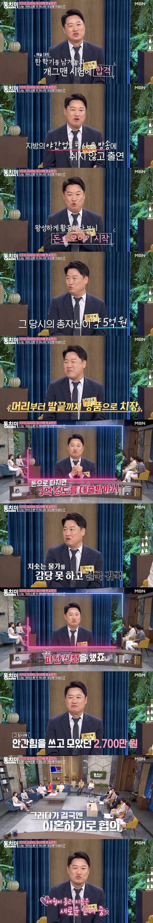 그는 "서울예대를 졸업해서 한학기 남기고 개그맨에 합격을 했다. K본부 10기로 데뷔를 했다. 방송에 잠깐만 얼굴을 내밀어도 얼굴을 다 알아보던 시절이었다. 그래서 지방 야간업소, 행사도 많이 하고. 그러다 보니 돈이 생기고. 서울예대 과 후배였던 전 아내와 결혼도 하고 행복한 생활을 했다"고 설명했다.