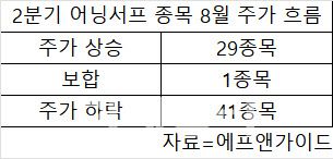 26일 에프앤가이드에 따르면 올해 2분기 연결 기준 컨센서스(추정기관수 3곳 이상)가 있는 국내 상장사 273곳 중 영업익이 추정치 대비 10% 이상 증가한 이른바 ‘어닝서프라이즈’를 기록한 71개 종목 중 41개의 8월 한 달간 주가가 하락한 것으로 나타났다. 영업적자를 기록할 것으로 예상됐으나 흑자를 낸 6곳 중에서도 4곳의 주가가 하락했다.