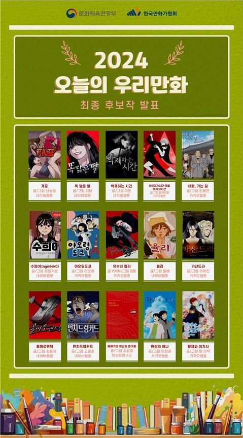 문화체육관광부와 한국만화가협회는 27일 '오늘의 우리 만화' 최종 후보작 열다섯 편을 공개했다. '개꿈'을 비롯해 '똑 닮은 딸', '박제하는 시간', '부르다가 내가 죽을 여자뮤지션', '세화, 가는 길', '수희O(tngmlek0)', '아오링 도쿄', '유부녀 킬러', '율리', '카산드라', '콜미로맨틱', '펀치드렁커드', '헤매기의 피곤과 즐거움', '환상의 애니', '황제와 여기사' 등이다.