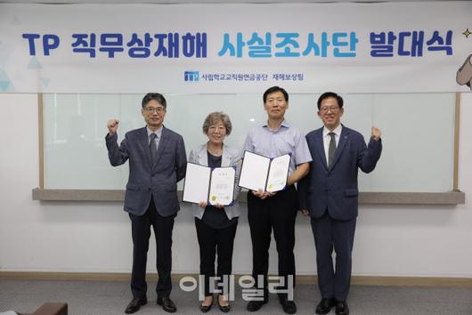 지난 26일 사학연금 나주 본사에서 열린 ‘TP 직무상재해 사실 조사단’ 발대식에 박동준 사학연금 복지사업실장(왼쪽부터), 박정모 조사단, 황인철 조사단, 김훈중 사학연금 연금사업본부장이 참석해 기념촬영을 하고 있다. (사진=사학연금) |