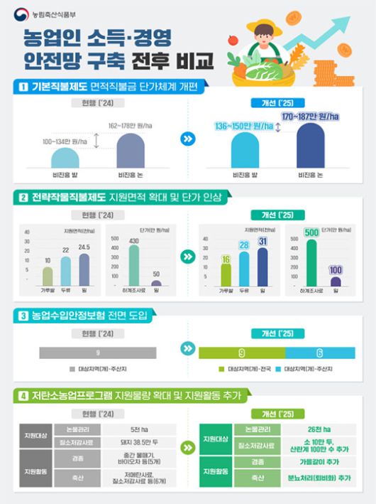 2020년 공익직불제 도입 후 고정된 기본직불금 단가를 상향 조정하고, 비진흥지역 논과 밭 간의 격차도 완화한다. 전략작물직불 지원면적과 지급단가도 인상한다.
