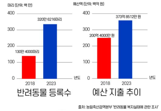 매년 발표된 농림축산검역본부 '반려동물 보호·복지 실태조사'를 종합하면 우리나라 반려동물 등록 수는 2018년 130만 4000마리에서 2023년엔 328만 6216마리로 5년 사이 2.5배로 늘었습니다.