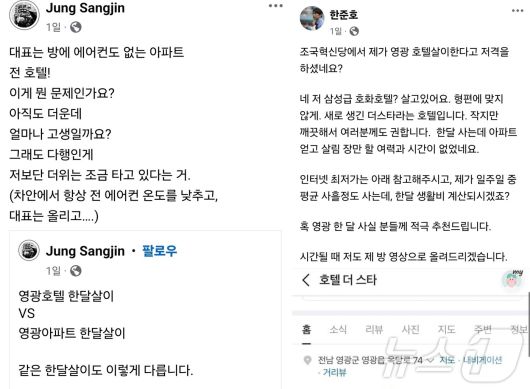 10·16 전남 영광군수 재선거를 앞두고 정상진 조국혁신당 홍보위원장(왼쪽)이 ‘호텔vs아파트’라는 글을 올리자 한준호 민주당 최고위원이 “최저가 6만원의 3성급 호텔이다”고 맞받았다.(출처 페이스북)2024.9.28./뉴스1 |
