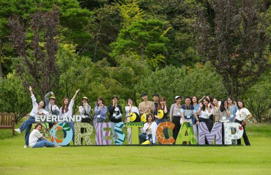 경기 용인 포레스트 캠프에서 열린 기업 행사 참가자들이 포레스트 캠프 레터링 조형물에서 기념촬영을 하고 있다. 삼성물산 리조트부문 제공 |