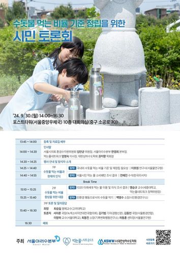 (서울=연합뉴스) 정수연 기자 = 서울시는 '수돗물 먹는 비율 기준 정립을 위한 시민 토론회'를 30일 오후 2시 중구 포스트타워에서 연다고 29일 밝혔다.
