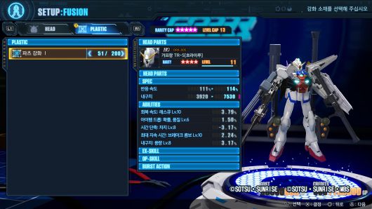이번 타이틀에서는 건프라를 조립할 때 양 손에 다른 파츠와 무기들을 장착할 수 있게 됐다. 거기에 무기별로 사용할 때의 차이가 있어 이는 건프라의 전투 성능을 고려할 때 중점적으로 여겨지는 부분이다. 더불어 각 파츠마다 등급과 레벨이 같으면 고정 능력치에는 차이가 없지만 무작위로 붙는 스킬이나 그 출력은 차이가 있어 극히 성능 세팅을 원한다면 파밍과 합성 계승의 과정을 자주 거치게 되는 식으로 진행하게 된다.