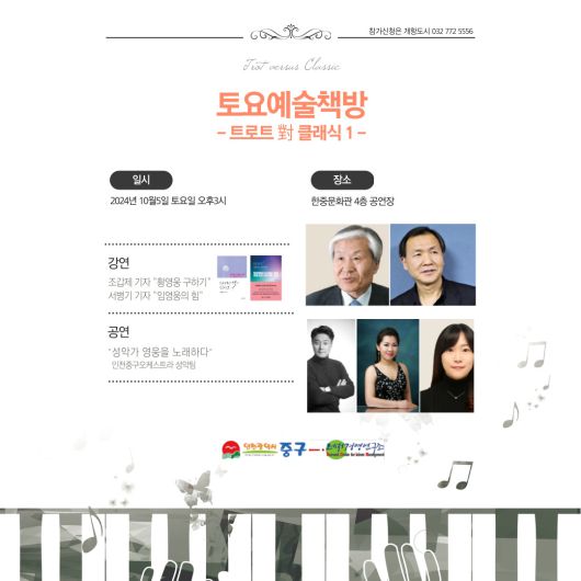 10월 5일(토) 오후 3시 인천 한중문화관 4층 공연장에서 토요예술책방을 개최한다. 주제는 ‘트로로트 對 클래식’ 서병기 기자와 조갑제 기자가 “임영웅의 힘”과 “황영웅 구하기”를 긱각 강연한다.