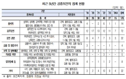 176건의 징계 중 72건은 음주운전과 관련된 것으로, 음주운전 및 사고 후 미조치, 치상, 무면허운전, 음주 측정 거부 등이었다.