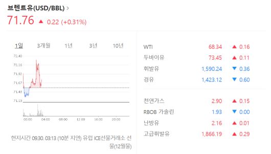 30일(현지시간) 유럽 ICE선물거래소에서 북해산 브렌트유 선물은 전거래일보다 0.31% 상승한 배럴당 71.76달러를 기록하고 있다. 서부텍사스산중질유(WTI) 선물도 0.16% 상승한 배럴당 68.34달러, 두바이유도 0.11% 상승한 73.45달러에 거래되고 있다.