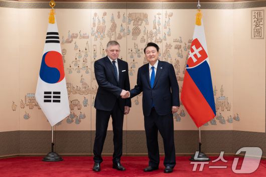(서울=뉴스1) 송원영 기자 = 윤석열 대통령이 30일 서울 용산 대통령실 청사에서 로베르트 피초 슬로바키아 총리와 기념촬영을 하고 있다. (대통령실 제공) 2024.9.30/뉴스1sowon@news1.krCopyright ⓒ 뉴스1. All rights reserved. 무단 전재 및 재배포, AI학습 이용 금지.