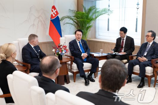 (서울=뉴스1) 송원영 기자 = 윤석열 대통령이 30일 서울 용산 대통령실 청사에서 로베르트 피초 슬로바키아 총리와 한·슬로바키아 소인수 회담을 하고 있다. (대통령실 제공) 2024.9.30/뉴스1sowon@news1.krCopyright ⓒ 뉴스1. All rights reserved. 무단 전재 및 재배포, AI학습 이용 금지.