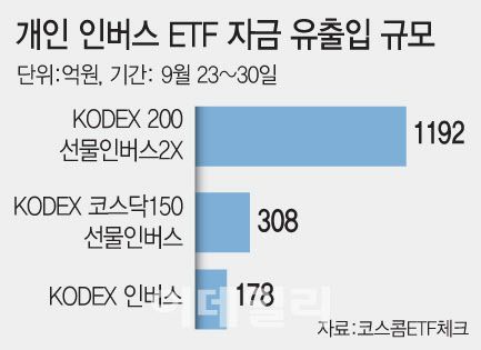 1일 코스콤 ETF 체크에 따르면 최근 일주일 개인 투자자들이 가장 많이 순매수한 상장지수펀드(ETF)는 코스피 지수 하락에 베팅하는 ‘KODEX 200선물인버스2X’로 집계됐다. 해당 상품은 코스피200지수의 일일 수익률을 음의 2배수로 추적하는 ETF로, 개인 투자자들은 한 주간 1192억원 규모로 순매수했다.