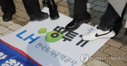 2021년 3월 LH 땅 투기 의혹에 분노한 인파가 '땅 투기'라고 쓴 종이판을 밟고 있다. |