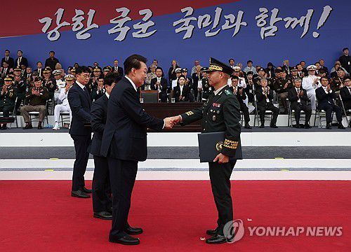 (성남=연합뉴스) 홍해인 기자 = 윤석열 대통령이 1일 성남 서울공항에서 열린 건군 제76주년 국군의날 기념식에서 김진호 육군 소장에게 보국훈장 천수장을 수여하고 있다. 2024.10.1 [대통령실통신사진기자단]