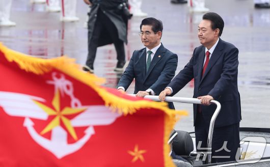 (성남=뉴스1) 김도우 기자 = 윤석열 대통령이 1일 경기도 성남 서울공항에서 열린 건군 제76주년 국군의 날 기념식에서 사열하고 있다. 2024.10.1/뉴스1pizza@news1.krCopyright ⓒ 뉴스1. All rights reserved. 무단 전재 및 재배포, AI학습 이용 금지.