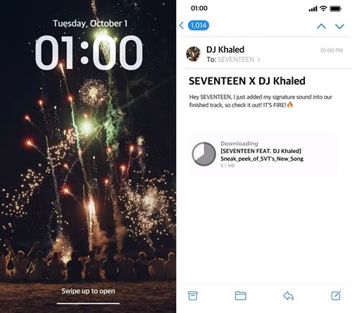 세븐틴(에스쿱스, 정한, 조슈아, 준, 호시, 원우, 우지, 디에잇, 민규, 도겸, 승관, 버논, 디노)은 1일 오후 1시 공식 SNS에 “DJ Khaled just sent a message - sneak peek alert!(DJ 칼리드가 메시지를 보냈습니다 - 예고 알림!)”이란 문구와 함께 영상 한 편을 게재했다.