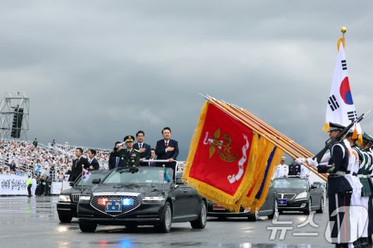 (서울=뉴스1) 송원영 기자 = 윤석열 대통령이 1일 오전 경기도 성남 서울공항에서 열린 건군 76주년 국군의날 기념식에서 김용현 국방부 장관과 사열하며 국기에 경례를 하고 있다. (대통령실 제공) 2024.10.1/뉴스1sowon@news1.krCopyright ⓒ 뉴스1. All rights reserved. 무단 전재 및 재배포, AI학습 이용 금지.