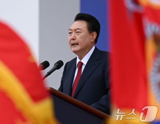 (서울=뉴스1) 송원영 기자 = 윤석열 대통령이 1일 성남 서울공항에서 열린 건군 76주년 국군의날 기념식에서 기념사를 하고 있다. (대통령실 제공) 2024.10.1/뉴스1sowon@news1.krCopyright ⓒ 뉴스1. All rights reserved. 무단 전재 및 재배포, AI학습 이용 금지.