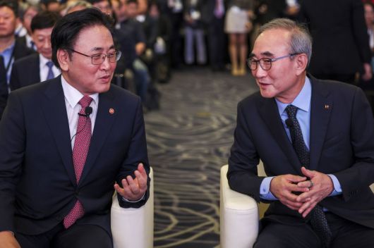 유상임 과학기술정보통신부 장관(왼쪽)과 김영섭 KT 대표가 1일 서울 중구 웨스틴조선호텔에서 열린 'M360 APAC'에서 대화를 나누고 있다. 연합뉴스 |