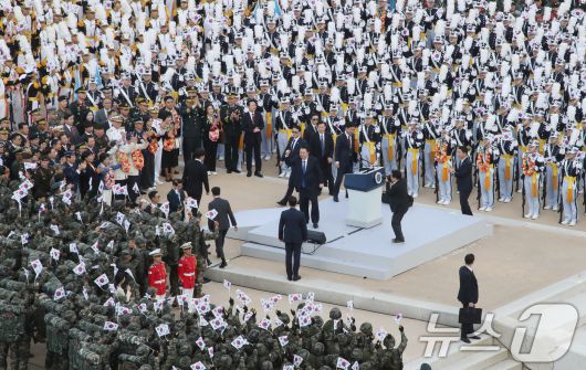 (서울=뉴스1) 임세영 기자 = 윤석열 대통령이 1일 오후 서울 세종대로 광화문광장 일대에서 열린 '건군 76주년 국군의날 시가행진'에서 격려사를 마치고 주먹을 불끈 쥐고 있다. '강한 국군, 국민과 함께!'라는 주제로 열린 이날 시가행진에는 병력 5000여명과 83종 340여 대의 장비가 참여했다. 2024.10.1/뉴스1