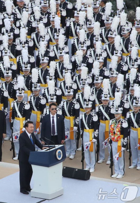 (서울=뉴스1) 임세영 기자 = 윤석열 대통령이 1일 오후 서울 세종대로 광화문광장 일대에서 열린 '건군 76주년 국군의날 시가행진'에 참석해 격려사를 하고 있다. '강한 국군, 국민과 함께!'라는 주제로 열린 이날 시가행진에는 병력 5000여명과 83종 340여 대의 장비가 참여했다. 2024.10.1/뉴스1