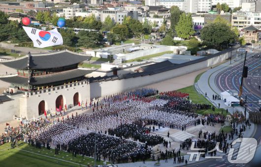 (서울=뉴스1) 임세영 기자 = 윤석열 대통령이 1일 오후 서울 세종대로 광화문광장 일대에서 열린 '건군 76주년 국군의날 시가행진'에서 격려사를 하고 있다. '강한 국군, 국민과 함께!'라는 주제로 열린 이날 시가행진에는 병력 5000여명과 83종 340여 대의 장비가 참여했다. 2024.10.1/뉴스1