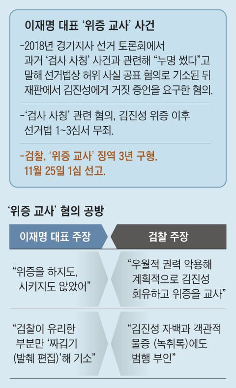 이 사건에서 유죄가 인정되고, 집행유예를 포함해 금고형 이상이 확정되면 이 대표는 의원직을 상실하고 다음 대선에도 출마할 수 없게 된다. 물론 무죄가 선고되면 이 대표는 사법리스크를 덜게 된다. 작년 9월 이 대표 구속영장을 기각한 유창훈 부장판사도 ‘위증교사는 소명된다’고 했던 사건이어서 만일 무죄를 받는다면 사법리스크 해소에 큰 의미를 갖는다. 이 사건 1심 결론은 오는 11월 25일 나올 예정이다.