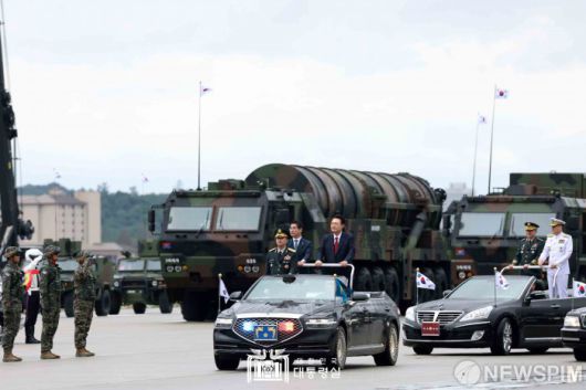 [서울=뉴스핌]윤석열 대통령과 김용현 국방부 장관이 1일 성남 서울공항에서 열린 건군 제76주년 국군의날 기념식에서 1호 열병차량에 탑승해 사열하며 원통형 발사대가 장착된 장비가 지대지 탄도미사일 현무-5 앞을 지나고 있다.[사진=대통령실] 2024.10.01 photo@newspim.com 저작권자(c) 글로벌리더의 지름길 종합뉴스통신사 뉴스핌(Newspim), 무단 전재-재배포 금지
