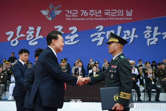 [서울=뉴스핌]윤석열 대통령이 1일 성남 서울공항에서 열린 건군 제76주년 국군의날 기념식에서 육군 제11기동사단(육군 소장 권혁동)에 부대표창을 수여하며 악수하고 있다. [사진=대통령실] 2024.10.01 photo@newspim.com 저작권자(c) 글로벌리더의 지름길 종합뉴스통신사 뉴스핌(Newspim), 무단 전재-재배포 금지