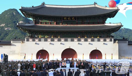 (서울=뉴스1) 송원영 기자 = 윤석열 대통령이 1일 오후 서울 세종대로 광화문광장 일대에서 열린 '건군 76주년 국군의날 시가행진'에서 국군장병들을 격려하고 있다. (대통령실 제공) 2024.10.1/뉴스1sowon@news1.krCopyright ⓒ 뉴스1. All rights reserved. 무단 전재 및 재배포, AI학습 이용 금지.