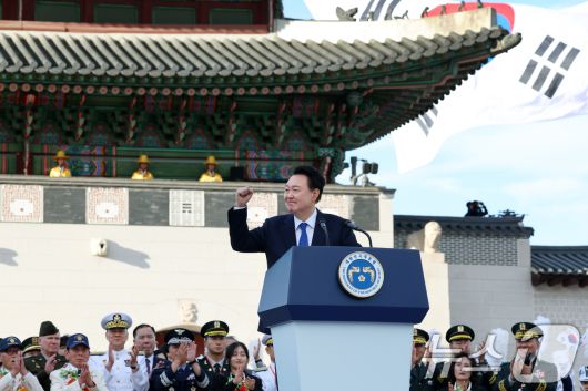 (서울=뉴스1) 송원영 기자 = 윤석열 대통령이 1일 오후 서울 세종대로 광화문광장 일대에서 열린 '건군 76주년 국군의날 시가행진'에서 국군장병들을 격려하고 있다. (대통령실 제공) 2024.10.1/뉴스1
