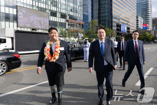 (서울=뉴스1) 송원영 기자 = 윤석열 대통령이 1일 서울 광화문 일대에서 열린 국군의날 시가행진에서 북한 목함지뢰 도발로 두 다리를 잃은 하재헌 중사와 함께 걸어가고 있다. (대통령실 제공) 2024.10.1/뉴스1sowon@news1.krCopyright ⓒ 뉴스1. All rights reserved. 무단 전재 및 재배포, AI학습 이용 금지.