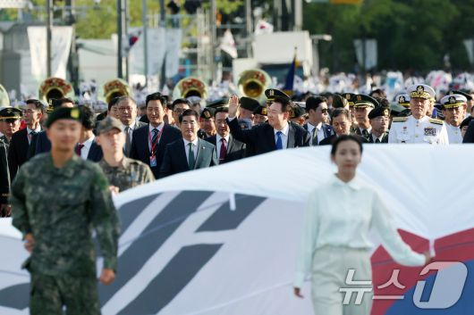(서울=뉴스1) 송원영 기자 = 윤석열 대통령이 1일 서울 광화문 일대에서 열린 국군의날 시가행진에서 대형 태극기를 선두로 국민과 함께 광화문 월대를 향해 행진하며 인사하고 있다. (대통령실 제공) 2024.10.1/뉴스1sowon@news1.krCopyright ⓒ 뉴스1. All rights reserved. 무단 전재 및 재배포, AI학습 이용 금지.
