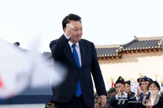 (서울=뉴스1) 송원영 기자 = 윤석열 대통령이 1일 오후 서울 세종대로 광화문광장 일대에서 열린 '건군 76주년 국군의날 시가행진'에서 국군장병들을 격려하고 있다. (대통령실 제공) 2024.10.1/뉴스1sowon@news1.krCopyright ⓒ 뉴스1. All rights reserved. 무단 전재 및 재배포, AI학습 이용 금지.