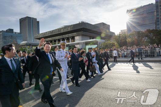 (서울=뉴스1) 송원영 기자 = 윤석열 대통령이 1일 서울 광화문 일대에서 열린 국군의날 시가행진에서 국민과 함께 광화문 월대를 향해 행진하며 인사하고 있다. (대통령실 제공) 2024.10.1/뉴스1