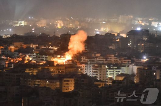 1일 (현지시간) 레바논 베이루트 남부 교외 지역에서 헤즈볼라와 분쟁 중인 이스라엘 군의 공습을 받아 불길이 치솟고 있다. 2024.10.01 ⓒ AFP=뉴스1 ⓒ News1 우동명 기자 |