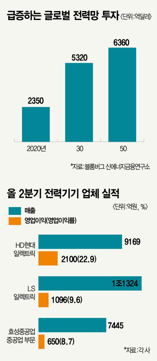 블룸버그신에너지금융연구소(BNEF)에 따르면 글로벌 전력망 투자 규모는 2020년 2350억달러에서 2030년 5320억달러, 2050년 6360억달러로 증가할 전망이다. 사실상 글로벌 전력망업계가 ‘슈퍼 사이클’을 맞았다는 분석이 나오는 이유다. 이민재 NH투자증권 애널리스트는 “북미의 노후 전력망 교체를 시작으로 유럽의 재생에너지 확대, 데이터센터와 생성형 AI 전력 수요 증가로 초고압부터 중저압 전력기기에 이르기까지 전 부문 투자가 급증하는 모습”이라고 진단했다.