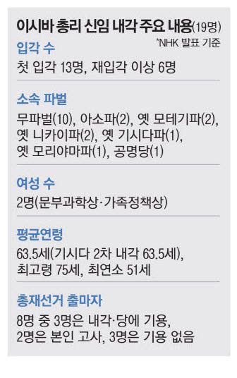 이에 앞서 이시바 총리는 총리공관에서 19명의 내각 인사를 발표했다. 일본 정부 대변인 격인 관방장관에는 옛 기시다파이자 자민당 총재선거에도 출마했던 하야시 요시마사 관방장관이 유임됐다.
