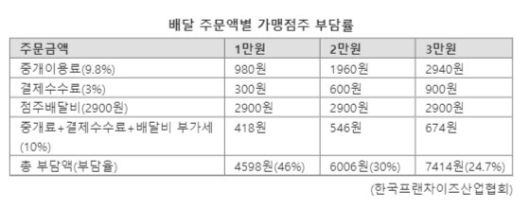 프랜차이즈업계 관계자는 "배달앱을 이용해 주문이 늘어나는 효과는 있을 수 있다"면서도 "배달 수수료가 과거 정액제에서 정률제로 바뀌면서 전체 매출이 늘어도 점주가 가져가는 이익은 미미하고 배달 플랫폼의 이익만 지속 증가한다"고 주장했다.
