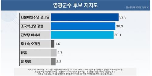 2일 여론조사기관인 리얼미터에 따르면 미디어트리뷴의 의뢰를 받아 지난달 29~30일 이틀간 영광군 거주 만 18세 이상 남녀 501명을 대상으로 조사한 결과 각 후보 지지율은 민주당 장세일 후보 32.5%, 혁신당 장현 후보 30.9%, 진보당 이석하 후보 30.1%로 나타났다.