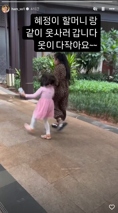 함소원은 2일 자신의 공식 사회관계망서비스(SNS)에 "혜정이 할머니랑 같이 옷 사러 갑니다. 옷이 다 작아요"라는 글과 함께 짧은 영상을 올렸다.