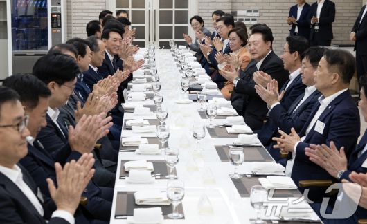 (서울=뉴스1) 송원영 기자 = 윤석열 대통령이 2일 서울 용산 대통령실 앞 파인그라스에서 추경호 국민의힘 원내대표 등 원내지도부와 여당 소속 국회 상임위원장 및 간사들과의 만찬에서 박수를 치고 있다. (대통령실 제공) 2024.10.2/뉴스1sowon@news1.krCopyright ⓒ 뉴스1. All rights reserved. 무단 전재 및 재배포, AI학습 이용 금지.