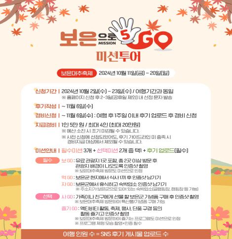 희망자는 이달 23일까지 홈페이지(http://boeun.missiontour.kr/)에 신청해 승인을 받아야 한다.