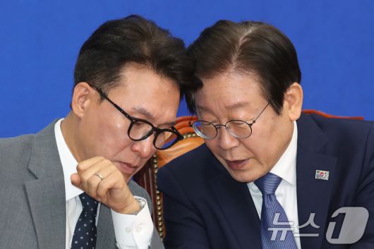 이재명 더불어민주당 대표와 김민석 최고위원이 27일 오전 서울 여의도 국회에서 열린 최고위원회의에서 대화하고 있다. 2024.9.27/뉴스1 ⓒ News1 이광호 기자 |
