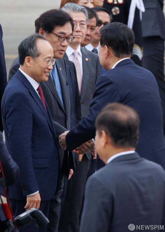 [성남=뉴스핌] 윤창빈 기자 = 필리핀, 싱가포르, 라오스 등 동남아 3개국 순방에 나선 윤석열 대통령이 6일 오전 경기 성남시 서울공항에서 환송 나온 정진석 비서실장과 인사하고 있다. 2024.10.06 pangbin@newspim.com |